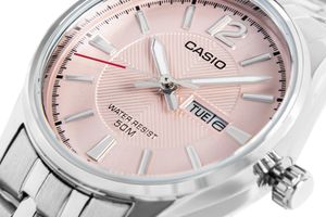 Damski zegarek CASIO LTP-1335D-5AVDF to idealny wybór dla kobiet ceniących subtelny styl, elegancję i funkcjonalność. Jego pudrowo-różowa tarcza o delikatnym efekcie sunray sprawia, że zegarek mieni się pod światłem, dodając głębi koloru i naturalnej elegancji. Srebrna bransoleta dopasowuje się lekko do nadgarstka, a datownik z dniem tygodnia dodaje funkcjonalności. Wodoszczelność do 50 metrów zapewnia spokój w codziennym użytkowaniu.