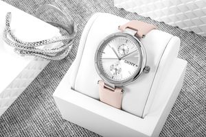 Skórzany pasek w kolorze pudrowego różu doskonale dopełnia projekt, zapewniając wygodę i eleganckie wykończenie. Model wyposażono w funkcjonalne subtarczki – górna wskazuje datę, a dolna pełni rolę zegara 24-godzinnego, dzięki czemu zawsze masz pełną kontrolę nad czasem.