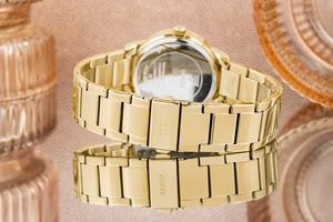 Guess Petal GW0747L2 to zegarek damski, który wyróżnia się nowoczesnym, a zarazem klasycznym złotym designem, podkreślającym kobiecą elegancję i pewność siebie. Koperta o średnicy 36 mm, wykonana ze stali szlachetnej w modnym złotym kolorze, została anatomicznie zaprojektowana, aby zapewnić wygodę noszenia przez cały dzień. Złota tarcza z wyraźnymi, biało-złotymi indeksami i wskazówkami oraz mineralne szkło o wysokiej odporności na zarysowania dbają o trwałość i czytelność czasomierza. Solidna, złota bransoleta ze stali nierdzewnej łączy trwałość z luksusowym wykończeniem, a zapięcie z logo Guess zapewnia bezpieczeństwo i prestiż.
