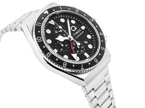 Timex Q TW2V69800 to męski zegarek, który łączy funkcjonalność z klasą. Dzięki możliwości śledzenia trzech stref czasowych, chronografowi i datownikowi, sprawdzi się zarówno w podróży, jak i na co dzień. Stalowa koperta i bransoleta w połączeniu z czarną tarczą tworzą elegancki, a zarazem techniczny wygląd. To model dla mężczyzny, który ceni precyzję i nowoczesny styl.